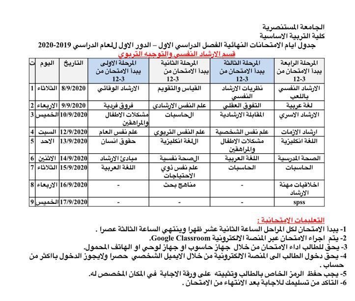 الجامعة المستنصرية قسم الارشاد النفسي و التوجيه التربوي الاساسية تعلن جدول امتحانات الدور الاول للفصل الدراسي الاول للدراسات الاولية للعام الدراسي 2019 2020