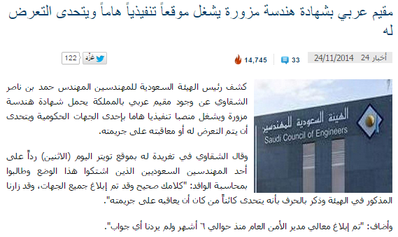 هاشتاق السعودية On Twitter مهندس بشهادة مزورة يتحدى الهيئة السعودية للمهندسين ورئيس الهيئة عبر تويتر أبلغنا عنه ولم يردنا أي جواب أخبار24 Http T Co Qyppcznyuc