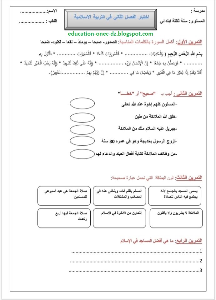 الاختبار الثاني في التربية الاسلامية سنة ثالثة ابتدائي المكيفة مع الجيل الثاني