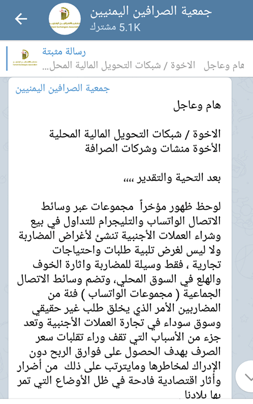 جمعية الصرافين اليمنيين تحذر أعضاء الجمعية من المضاربة بالعملة عبر استخدام مواقع التواصل الاجتماعي جمعية البنوك اليمنية